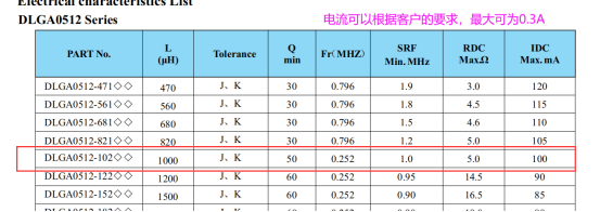 客戶原先使用的是B82144A2105J色環電感,這款電感對應谷景的DLGA0512-102JTB,在參數上,TDK的電流只能做到0.2A,谷景的可以做到0.3A。